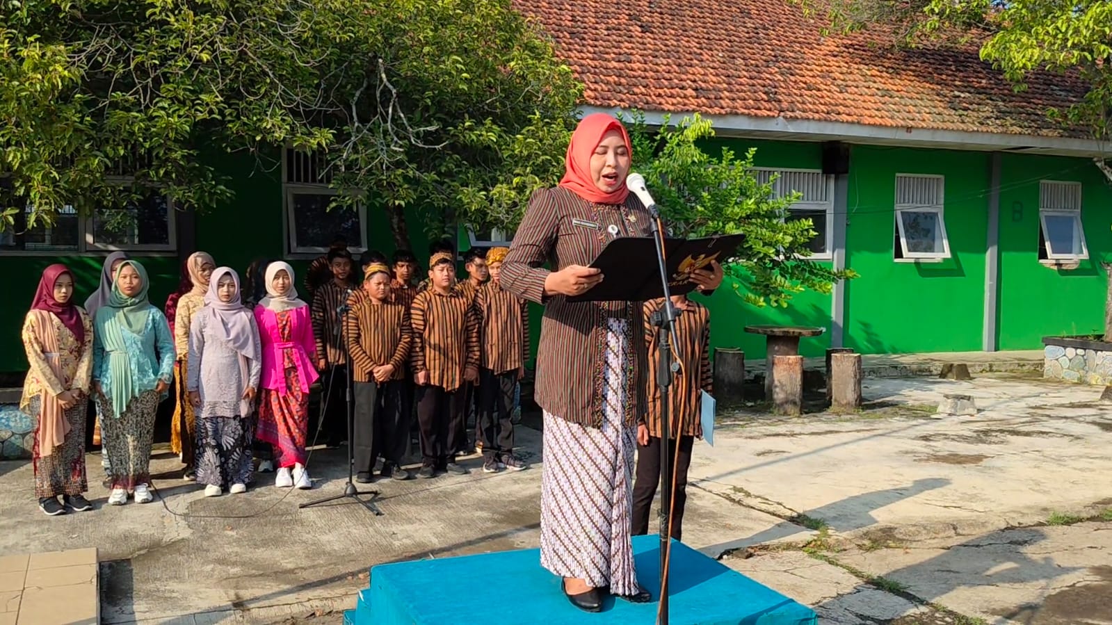 Pemandangan di lapangan upacara pagi itu bak sebuah peta budaya Indonesia yang hidup. Beragam corak dan warna busana tradisional, mulai dari Baju Kurung Melayu, Beskap Jawa, hingga pakaian adat suku Dayak, menyatu dalam barisan yang rapi dan khidmat. Upacara dipimpin langsung oleh Ibu Rina Rahmawati, S.Pd., Pembina Upacara yang tampil anggun dengan balutan pakaian adat, memberikan kesan berwibawa sekaligus menanamkan rasa bangga terhadap keberagaman.